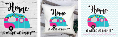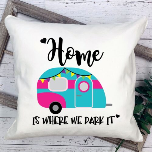 This Home Is Where We Park It quote comes in SVG format, and features a cute retro travel trailer. It’s perfect for creating decor for the RV, such as htv pillow projects, signs, or coffee cup logos.