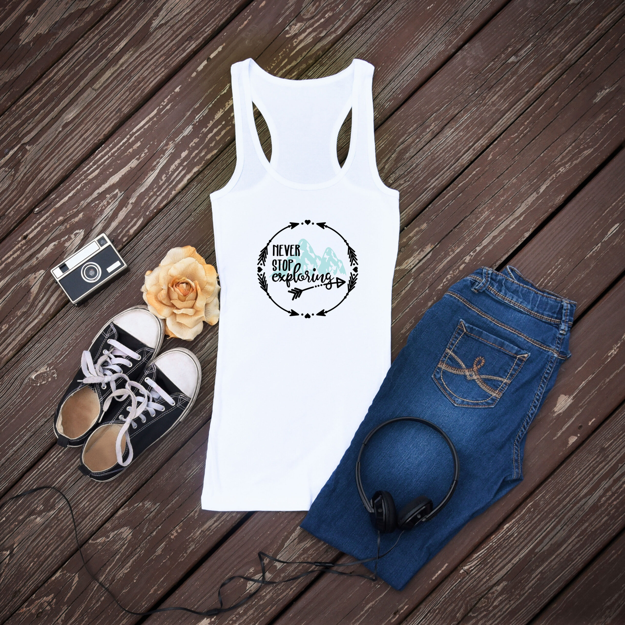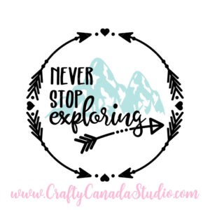 This quote, Never Stop Exploring, comes in SVG format, and features mountains and arrows.
